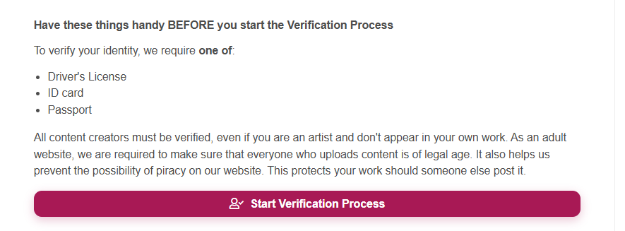 Next, just follow the instructions and click Start Verification Process. You'll need a current, valid photo ID, such as a passport or driver's license.