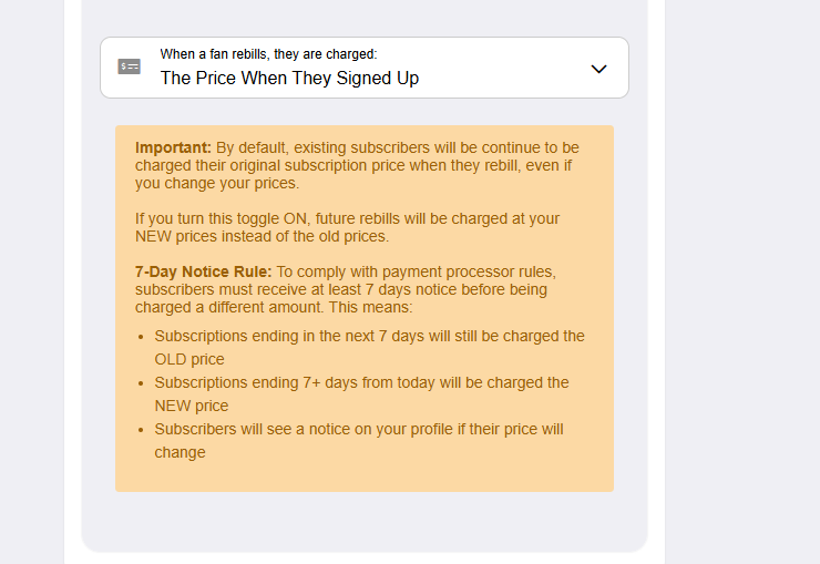 To adjust this option, set "When a fan rebills, they are charged:" to "The Price When They Signed Up" or "My Current Price" as your preference dictates.