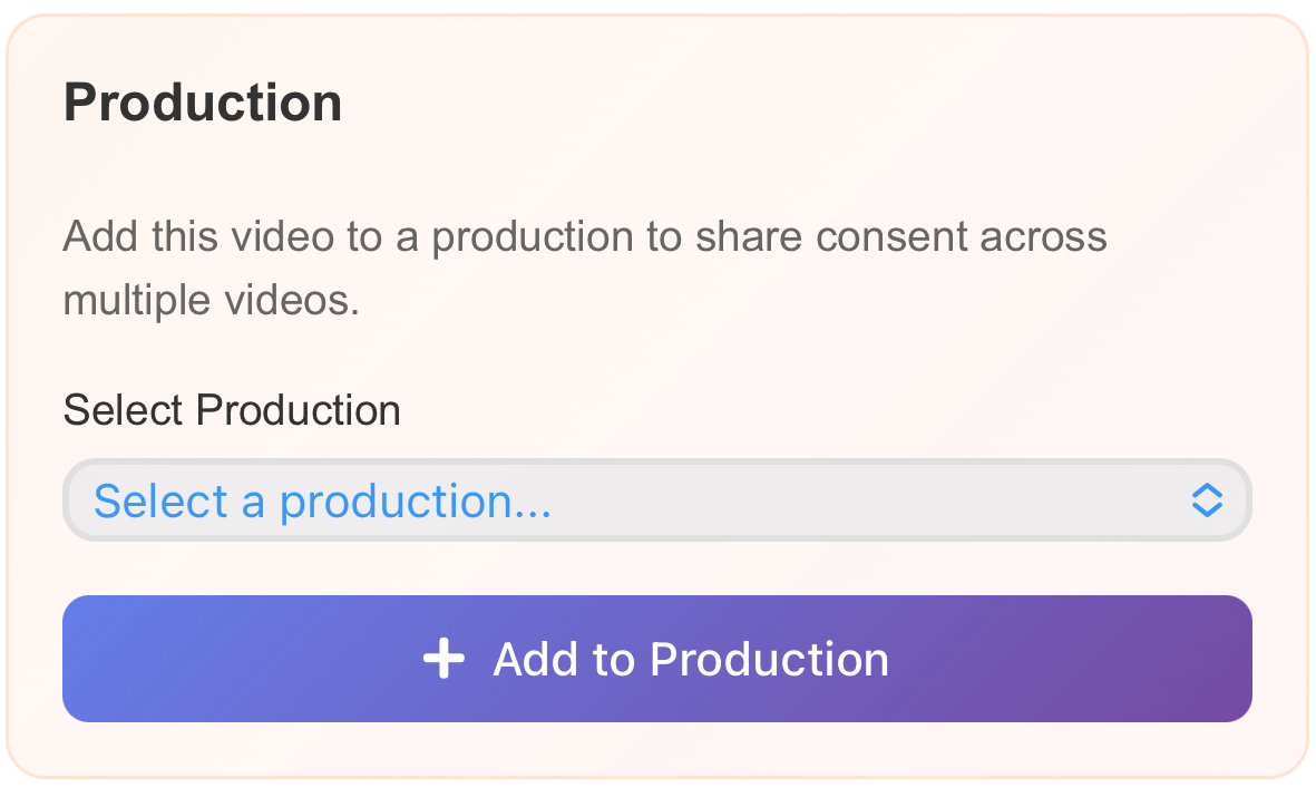 If you use Productions to manage consent, select the correct name from the drop down menu, and click the button labelled “Add to Production” to add the video.